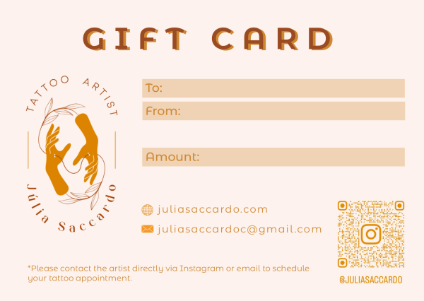 You can gift someone a personalized tattoo voucher! Simply contact me directly by email or through the form on the "Contacts" page of the website to get your card with the amount you choose.