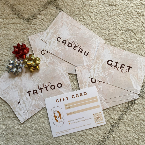Vous pouvez offrir une carte cadeau pour un tatouage personnalisée ! Contactez-moi directement par e-mail ou via le formulaire sur la page "Contacts" du site pour obtenir votre carte avec le montant de votre choix.